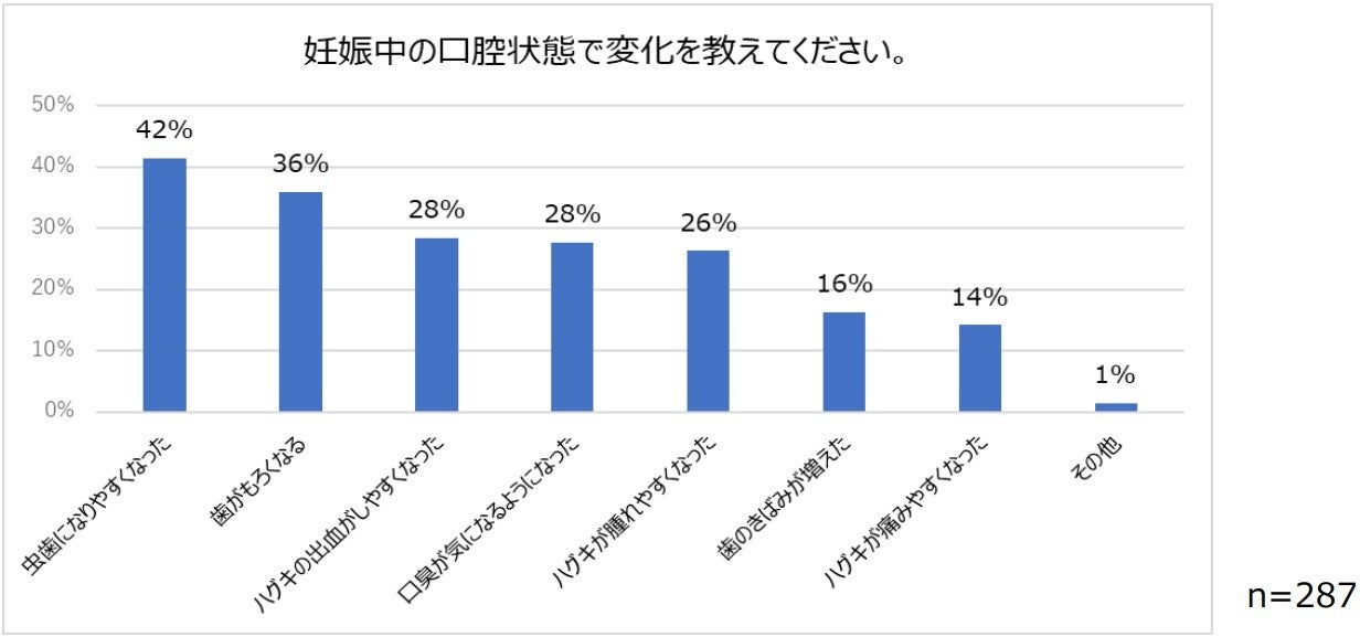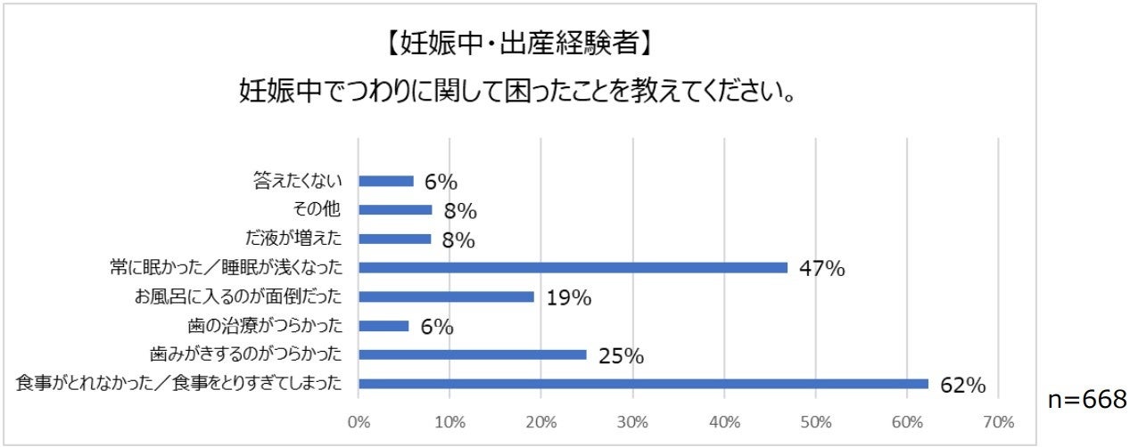 「妊娠中でつわりに関して困ったことを教えてください」という質問に対し、「食事がとれなかった/食事をとりすぎてしまった」、「常に眠かった/睡眠が浅くなった」に次いで「歯みがきをするのがつらかった」と回答した人が多い結果に。