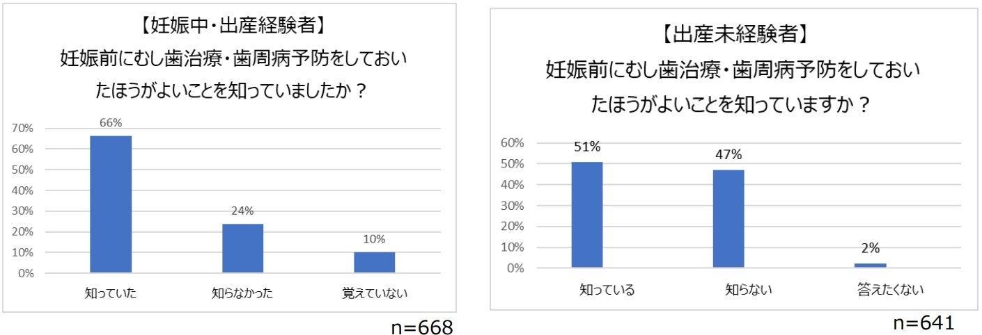 ①妊娠中・出産経験のある人で妊娠前から「むし歯予防・歯周病予防」をしたほうが良いことを知っていた方は約7割(66%)、対して、出産経験のない人で、知っていた方は5割(51%)にとどまり、妊娠・出産がきっかけとなり、事前の歯科健診受診等の予防の重要性の大切さを知る方が多くいることが分かった。
