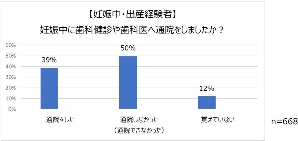 また、妊娠中の歯科健診や歯科医への通院は、約5割の方が「通院しなかった(できなかった)」と回答。その要因として、「歯科医院に行くのが大変」や「つわりで治療を受けるのがつらい」、「妊娠後期はおなかが大きくて治療台に乗れない」など、妊娠中のオーラルケアにおいて様々な課題を抱えていた方が多いことが分かりました。
