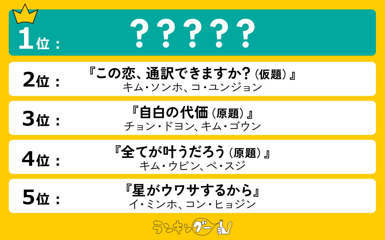 1位は2021年よりスタートした人気シリーズの第3部『「イカゲーム」シーズン3』に決定!2位は国際派胸キュンラブコメの『この恋、通訳できますか?(仮題)』。3位は実力派キャストの共演で注目を集めているミステリースリラー『自白の代価(原題)』。4位はラブコメドラマ『全てが叶うだろう(原題)』。そして、僅差で5位にランクインしたのは、ロマンティック・コメディの『星がウワサするから』でした!