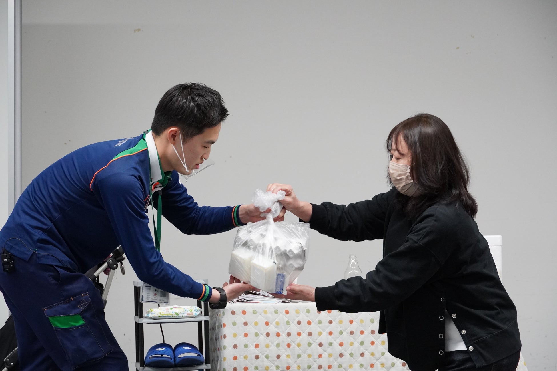 玄関先で商品を直接手渡す際の「あいさつと所作」「言葉づかい」「心くばり」「応対力」「品質」の5項目で得点を競います。利用者役は実際に配送時に受けた問い合わせ内容などを質問として投げかけ、配達担当の適切な応対を引き出します。