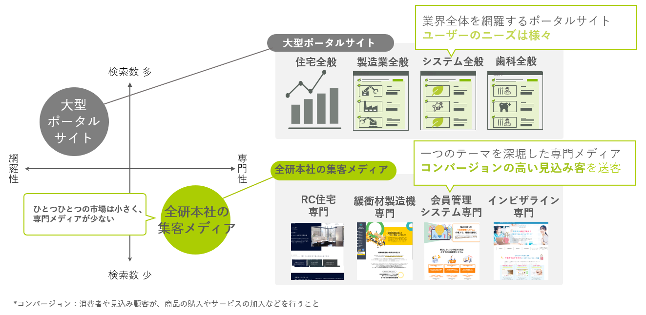 全研本社のコンテンツマーケティング事業では、顧客の特徴や強みを明らかにするWEBの集客メディアを制作・運用しています。集客メディアの特徴として、大型ポータルサイトの制作ではなく、市場規模が小さい専門領域に絞ったメディアを制作しています。専門性が高く狭域な分野でのメディア制作をおこなうことで、目的が明確な「意欲ある」ユーザーに訴求しております。また専門性が高いメディアを制作するため、不動産や金融、医療、製造など様々なジャンルに精通したSOHOライター1,000人以上が登録するプラットフォームを運営し、社内に在籍する約160名の編集ディレクターが一気通貫でメディアを制作できる体制を有しています。