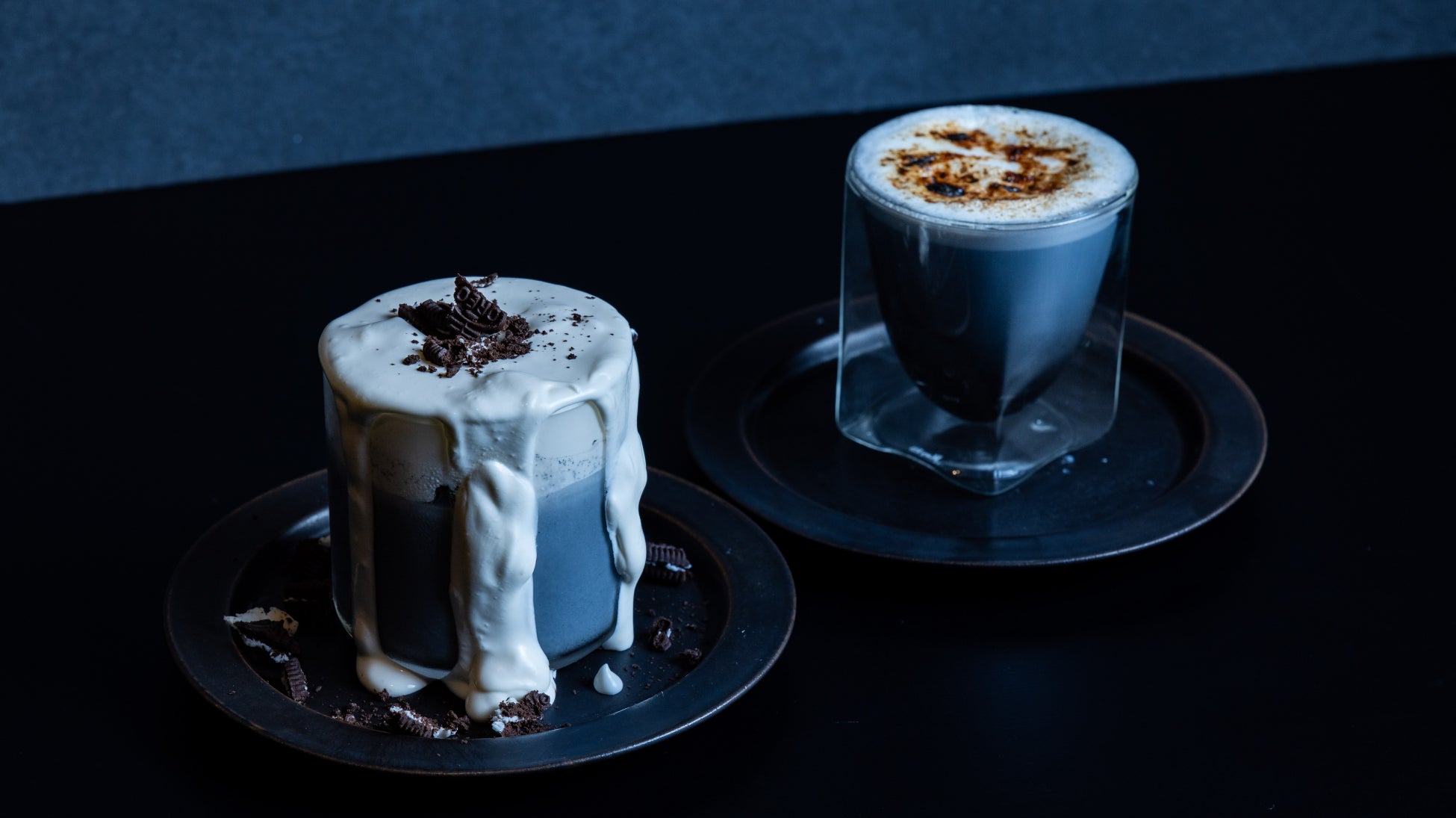 竹炭を使用したブラックラテに生クリームをのせ、オレオを砕いてトッピングしました。