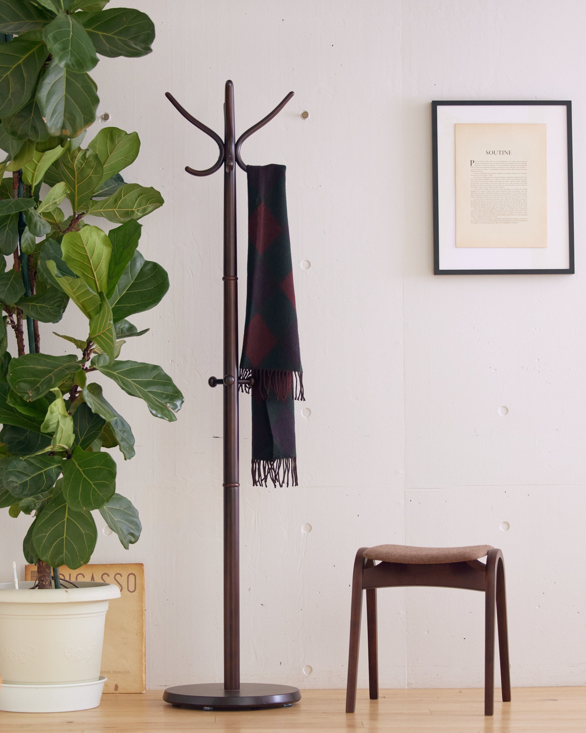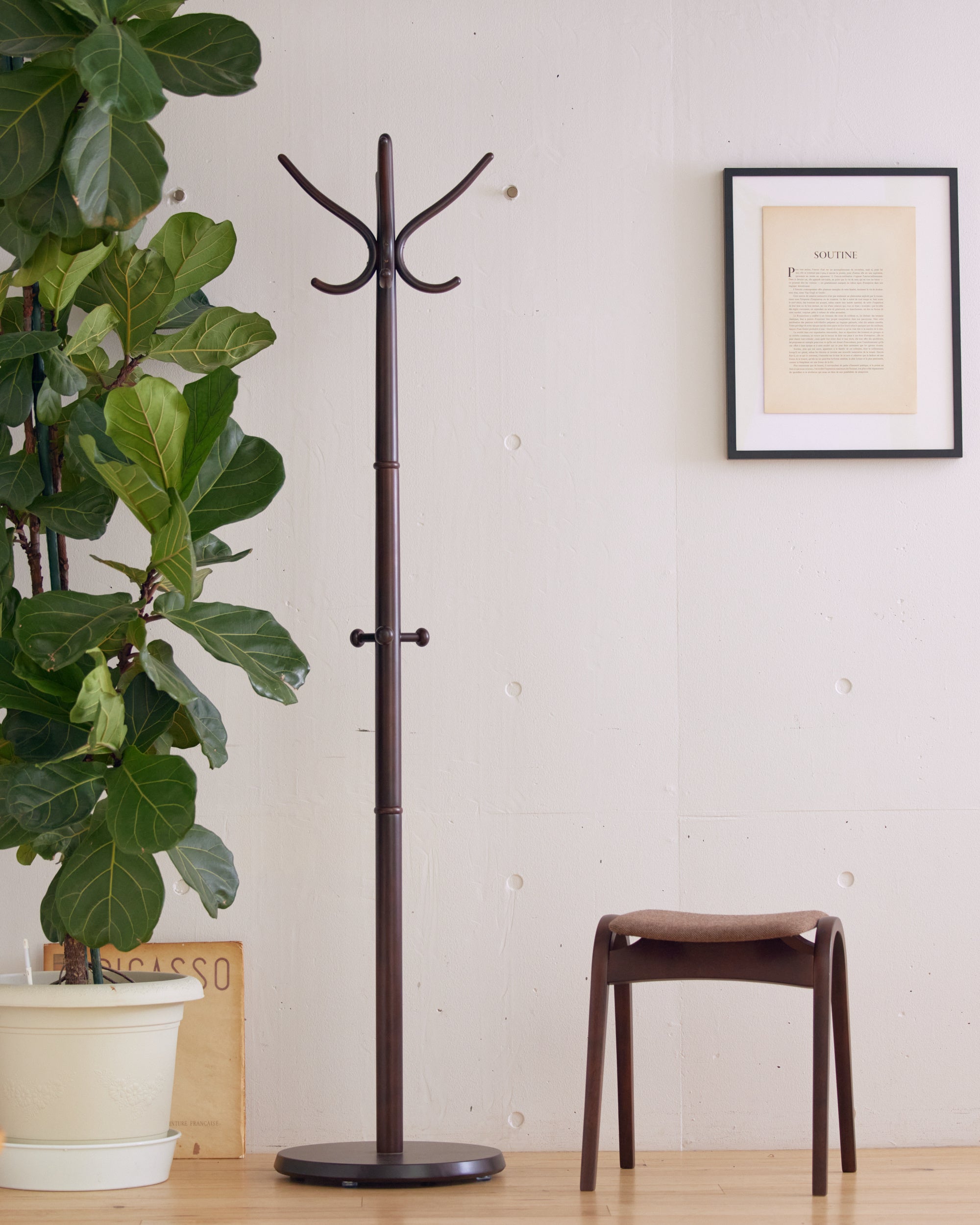 日本唯一の曲木家具の専門工房「秋田木工」から、玄関にあるとうれしいコートスタンドとスツールをセットにしました。