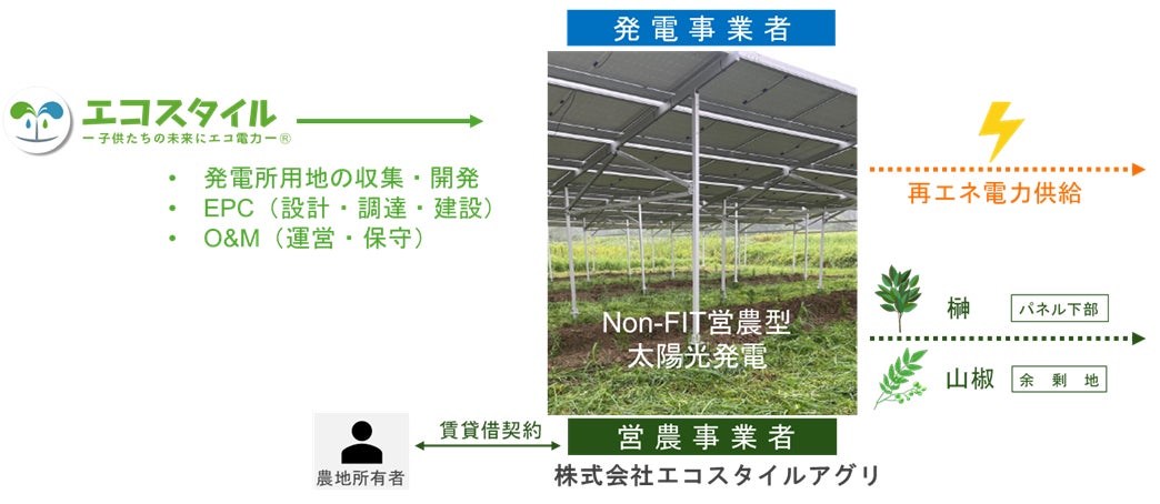 当社は、第一種農地の耕作放棄地を活用した発電所用地の収集・開発からEPC(設計・調達・建設)、稼働後のO&M(運営・保守)を発電事業者に提供し、エコスタイルアグリにおいて榊や山椒等の生産を行います。