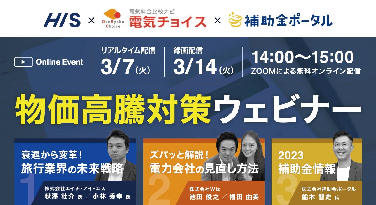 3月7日(火)、3月14日(火)※、株式会社Wiz(本社:東京都豊島区、代表取締役社長:山崎 俊)は、株式会社エイチ・アイ・エス、株式会社補助金ポータルと、オンラインセミナー「2023補助金も解説!物価高騰対策ウェビナー~電気代から出張費まで~」を開催いたします。