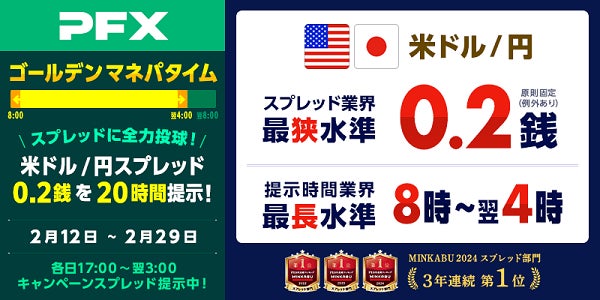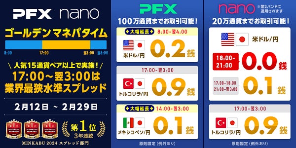 さらに、「パートナーズFX」「パートナーズFXnano」両方の商品において、17時00分~翌3時00分の時間帯をゴールデンマネパタイムとし、「米ドル/円」を含む全18通貨ペアで、スプレッドを業界最狭水準で提示するキャンペーンも実施しております。