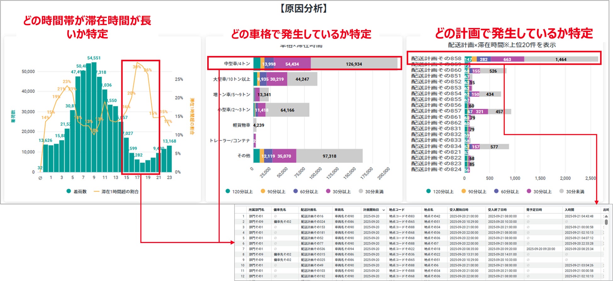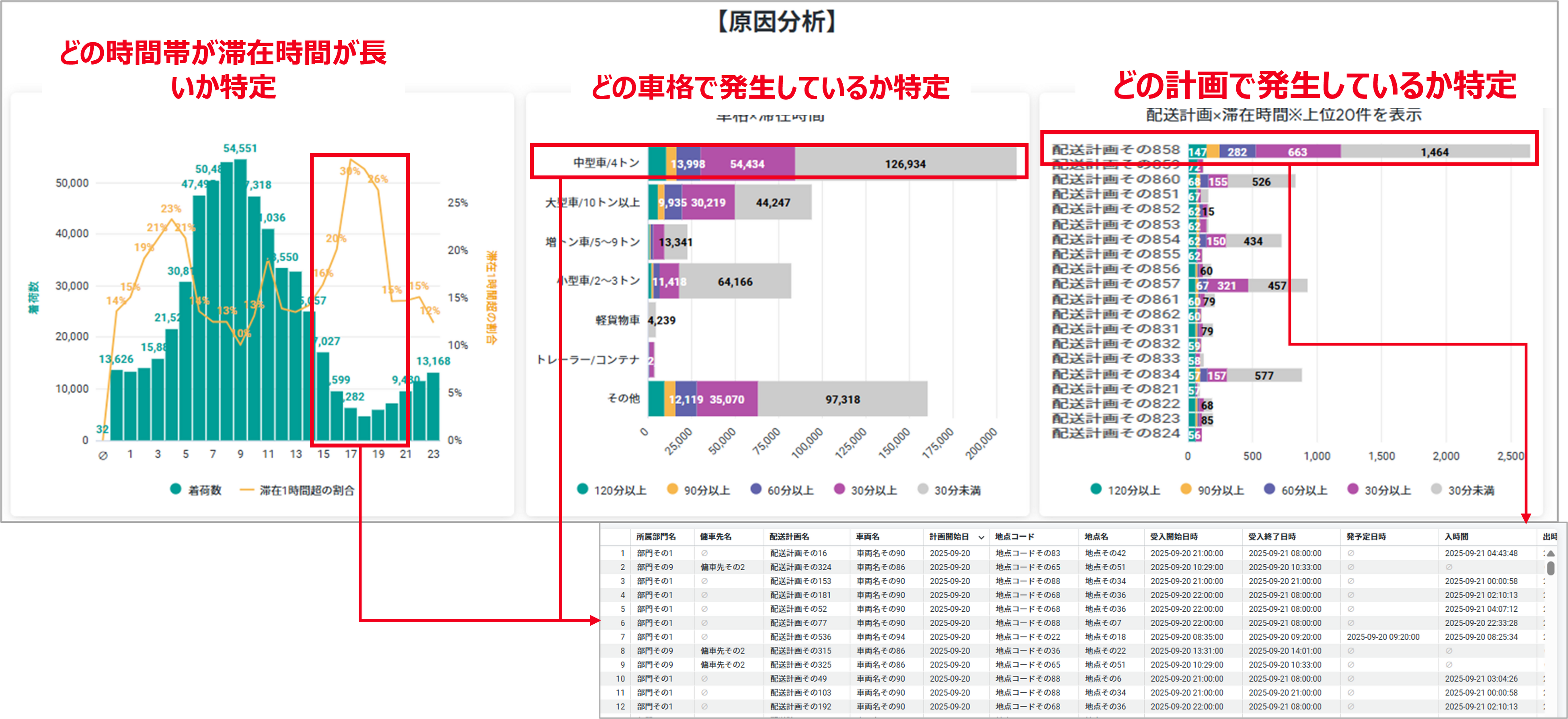 課題の発見後は、標準フォーマットに従って操作することで、時間帯や車格・配送計画といった軸で発生傾向を分析し、実データまで簡単に深堀りが可能です。これにより、「午前中の拠点のオペレーションを改善すべき」「特定の配送計画(ダイヤ)を改善すべき」といった解決策を迅速に導き出すことができます。