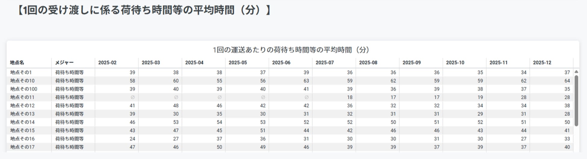 特定事業者に求められる定期報告のフォーマットに合わせ、MOVO Fleetによって取得された地点滞在時間を「荷待ち時間等」として集計することが可能です。