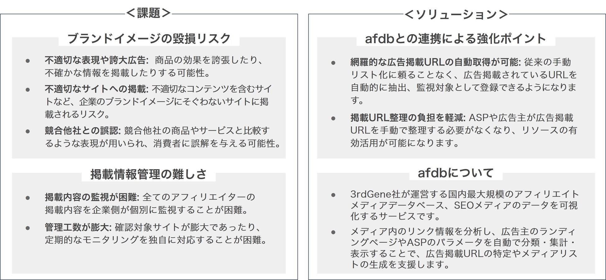 イー・ガーディアン株式会社(https://www.e-guardian.co.jp/ 東京都港区 代表取締役社長:高谷 康久 以下、「イー・ガーディアン」)と、株式会社CARTA HOLDINGS(https://cartaholdings.co.jp/ 東京都港区 代表取締役社長執行役員:宇佐美 進典 以下「CARTA HD」)との合弁会社である、株式会社ビズテーラー・パートナーズ(https://biztailor.co.jp/ 東京都港区 代表取締役社長:倉持 良 以下「ビズテーラー・パートナーズ」)は、株式会社3rdGene(京都世田谷区 代表取締役社長:諸星慎二、以下「3rdGene」)が提供するアフィリエイト広告向けSEOデータ分析ツール「afdb」との連携を開始いたしました。本取り組みにより、広告掲載URLの網羅的な自動取得が可能となり、アフィリエイト・サービス・プロバイダー(ASP)におけるアフィリエイト広告の監視精度と効率性が向上します。また、広告主にとって意図しない不適切なサイトへの広告掲載を削減し、ブランド毀損リスクの低下にも寄与します。