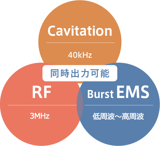 従来の業務用ボディケアマシンでは、RF→キャビテーション→EMS をそれぞれ単独で出力していましたが、「キャビスパ for Pro」シリーズは3種類の機能を同時出力。超音波振動によるキャビテーションに加えて、ラジオ波による温熱、Burst EMSによる筋肉刺激を組み合わせた複合的なトリートメントで集中アプローチ。 サロンが抱える課題を解決しながら、効率的なボディケアによりお客さまの満足度アップにつながるマシンです。