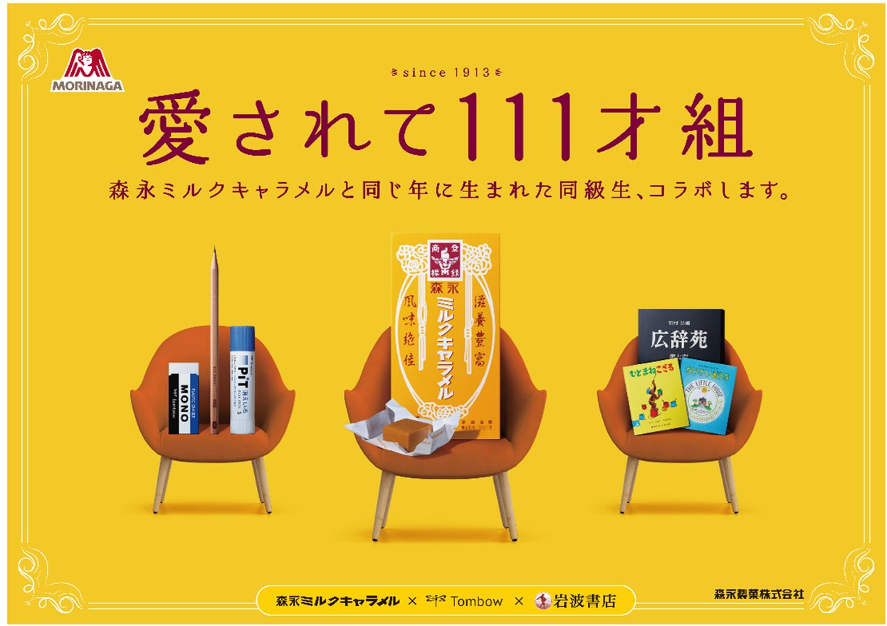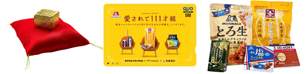 本キャンペーンでは、「森永ミルクキャラメル」と同じ年に生まれた同級生である、岩波書店・トンボ鉛筆とコラボしたキャンペーンを実施。「森永ミルクキャラメル」がデザインされた「広辞苑」や「モノ消しゴム」だけでなく、表面が金箔で覆われたミルクキャラメルなどの豪華限定賞品が合計1,111名様に当たります。