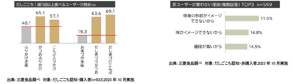 しかしながら商品として認知はしているものの、購入したことのないユーザーにとっては「中身の形状がイメージしづらい」、「味がイメージできない」などといった理由が購入のハードルになっていることが調査(右下図)で明らかになりました。
