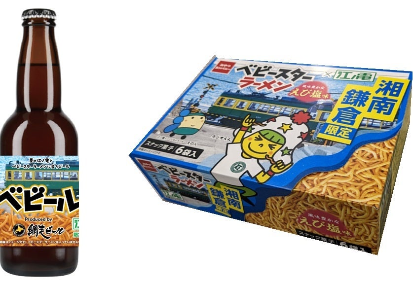 江ノ電×ベビースターのコラボ限定商品として、湘南・鎌倉限定のご当地ベビースター「ベビースターラーメン(えび塩味)」を発売します。加えて、2022年に好評を博したベビースターに合うビール『べビール』も江ノ電オリジナルラベルで先行発売となります。ベビースターの旨みに負けないよう、ロースト感を際立たせることで、豊かな香りとコク、麦の味わいが広がり、ベビースターの深い味わいにもマッチするビールへ進化しています。
