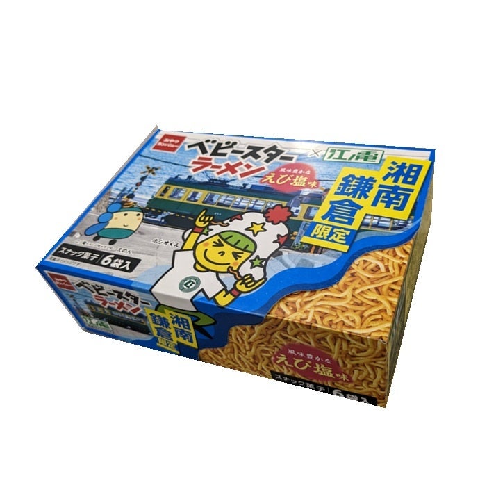 旅の想い出に、個包装が6袋入った「ベビースターラーメン(えび塩味)」を買うものよし!おなじみのチキン味のベビースターと共にキンキンに冷やした『べビール』を用意して、夏の江ノ電を満喫するもよし!さぁ、あなたもベビースターの江ノ電ラッピングトレインと一緒に夏の想いで出づくりに出発!