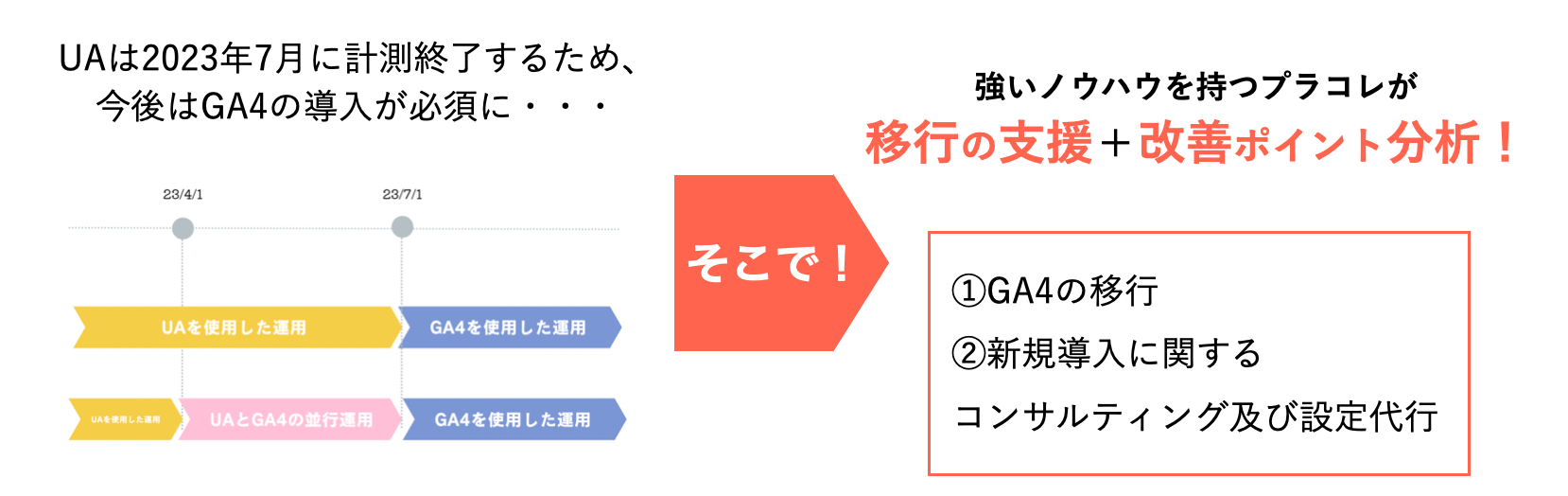 UAは2023年7月に計測終了するため、今後は導入が必須になったGA4。強いノウハウをもつプラコレが移行の支援から、新規導入にあたってのコンサルティング、及び改善ポイントの分析を個別に実施。