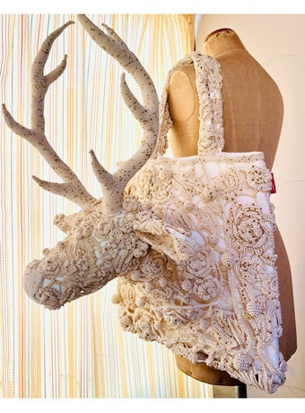 細い糸にビーズを通して、植物モチーフのレースを編み、すっぽりと鹿を覆っています。