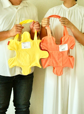 人と人との繋がりのきっかけとなるバッグを制作しました。それぞれがパズルのピースの形になっており、お互いの凸凹が合うようになっています。自分と相手のへこみと出っ張りがぴったり合うと、家族や友達同士であればさらに仲良くなれそうですし、街中で初めて出会う人同士でも互いに笑顔になり、自然と会話が生まれそうです。