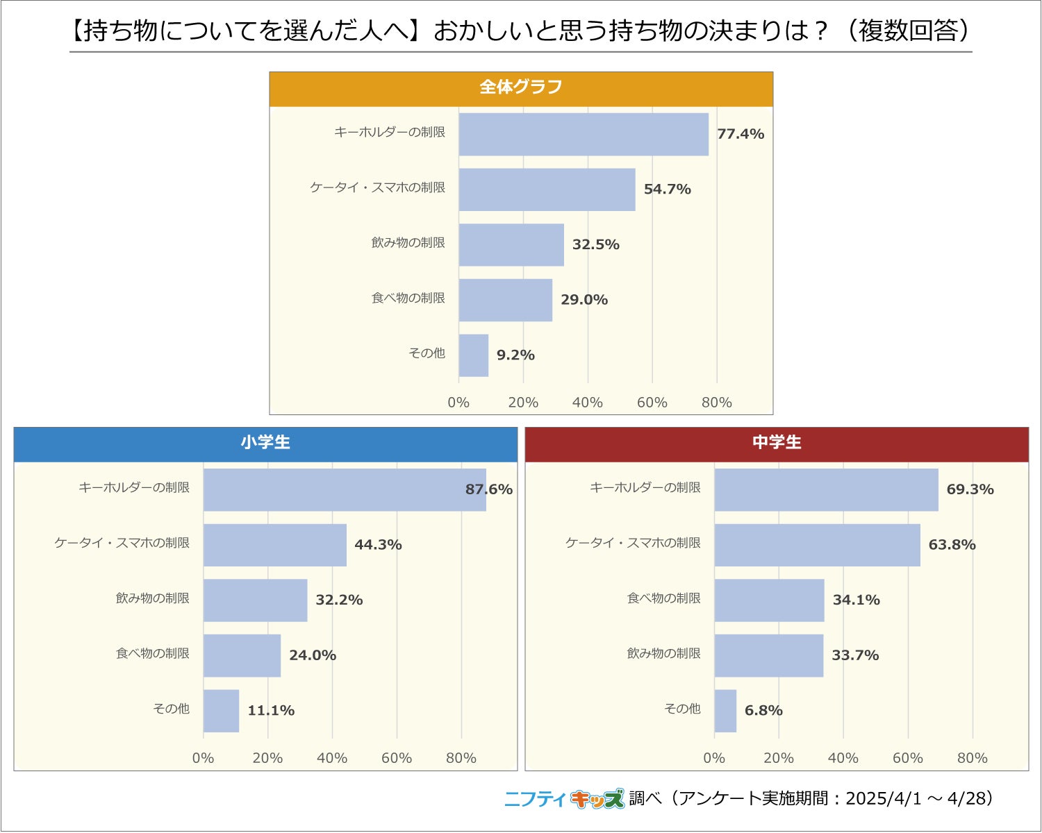 小中学生ともに、最多の回答は「キーホルダーの制限」で、次が「ケータイ・スマホの制限」でした。