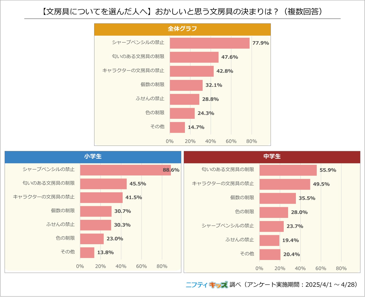 「匂いのある文房具の制限」「キャラクターの文房具の禁止」は小中学生ともに上位となりました。