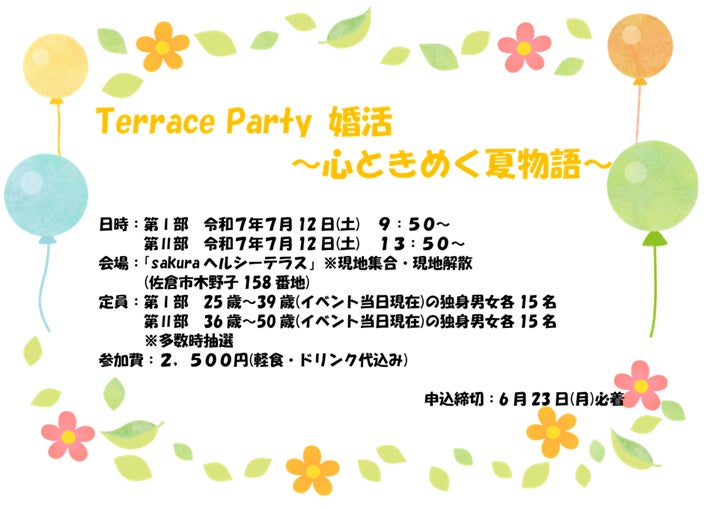 【千葉県佐倉市】第44回 令和7年度第1弾は、年齢別2部制!佐倉市の婚活イベント「Terrace Party 婚活~心ときめく夏物語~」開催決定!