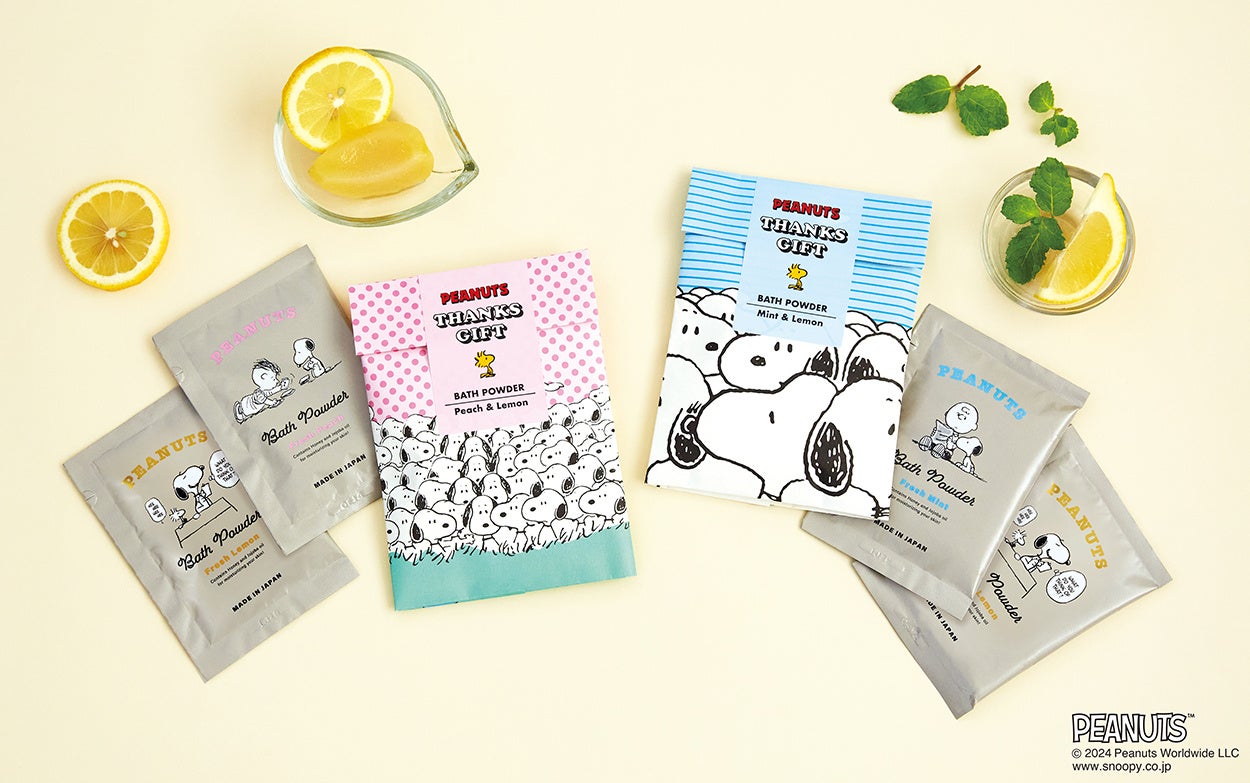 ビーグルが描かれたデザインパッケージに包まれたバスパウダー2包セット。パッケージのシールにはウッドストックとともに「THANKS GIFT」の文字がプリントされ、ちょっとしたお礼やお配りにもおすすめです。