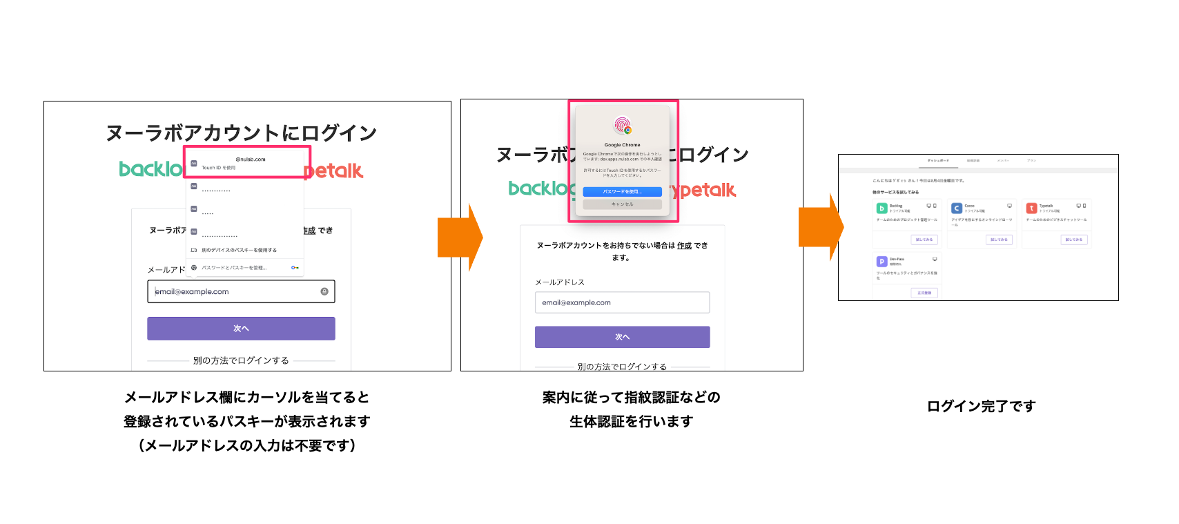 詳しい設定手順は、ヌーラボサポートページ「パスキー(パスワードレス認証)の設定」からご確認ください。