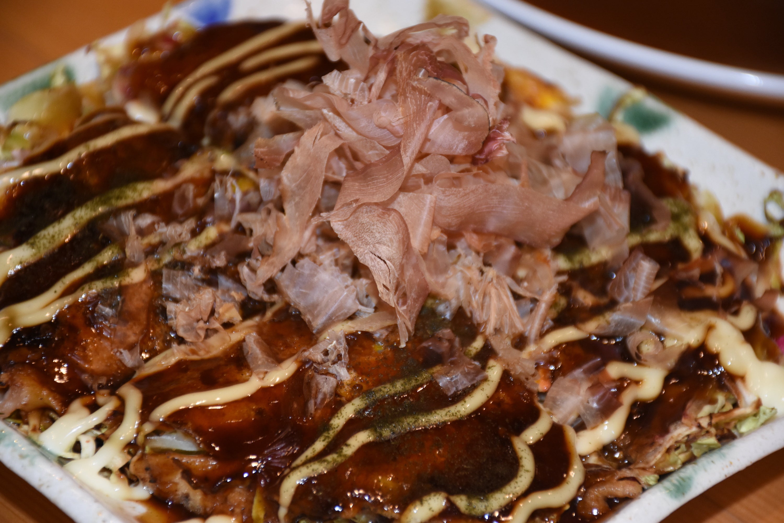 「ALL豊橋産 米粉のグルテンフリーお好み焼き」(1100円)を作った「鉄板焼き とらのこ」(駅前大通り1)。小麦粉よりもモチモチとした食感で、腹持ちもよく、具材のうずら卵と豚肉、キャベツ、塩麹とすべて地元産にこだわりました。青ノリの代わりに州田園の大葉粉をかけて仕上げています。米粉を提供した「清須ライスセンター」は、「よく味わうとお米の風味もあり、食感も米粉ならでは。ぜひご堪能ください」とPRしました。