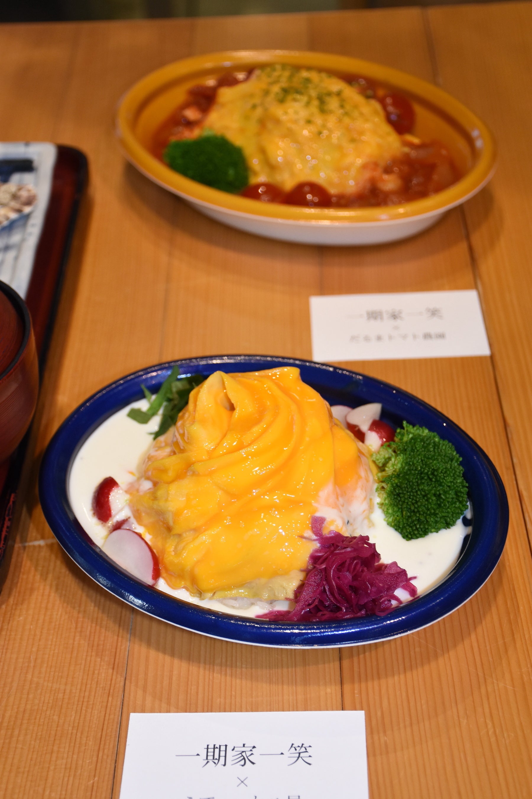 八百屋「一期家一笑」(下地町)はオムライス。「鈴木さんのだるまトマトのふわとろオムライス」(979円)は、ミニトマトを塩とオリーブオイルだけで味付けしたソースを盛り付けています。和風の「らでぃっしゅ屋さんの明太クリームオムライス」(979円)には、ラディッシュを生のまま使い、色味と辛味を生かしています。「だるまトマト農園」は「今年は例年にない暑さで、まだまだ味がのってきてないので、悔しいところですが、12月が過ぎて旬の時期になったら、またおいしくなります。一期家一笑さんにぜひ足を運んで食べてほしい」と話しました。