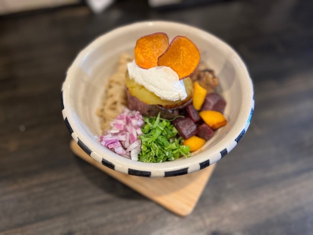 その他、発表会に不参加でしたが、ラーメン屋「ORIBE(おりべ)」(井原町)は、「5種のさつま芋まぜそばfm農園そもそも」(1350円)を考案。5品種のサツマイモを4種類の調理方法で作るサツマイモづくしのまぜそばで、11月25日から限定200食で提供します。