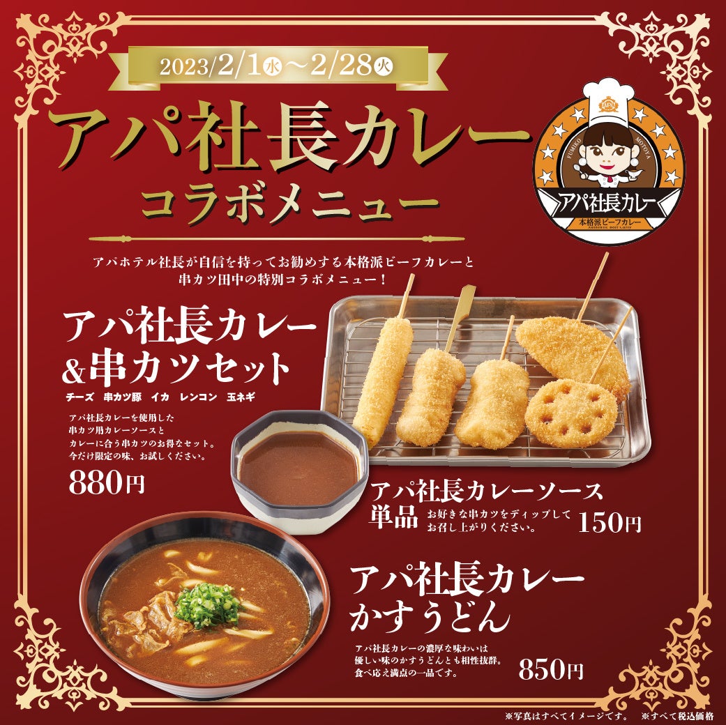 2月1日(水)より期間限定で『アパ社長カレー』コラボメニューを全国の串カツ田中で販売。