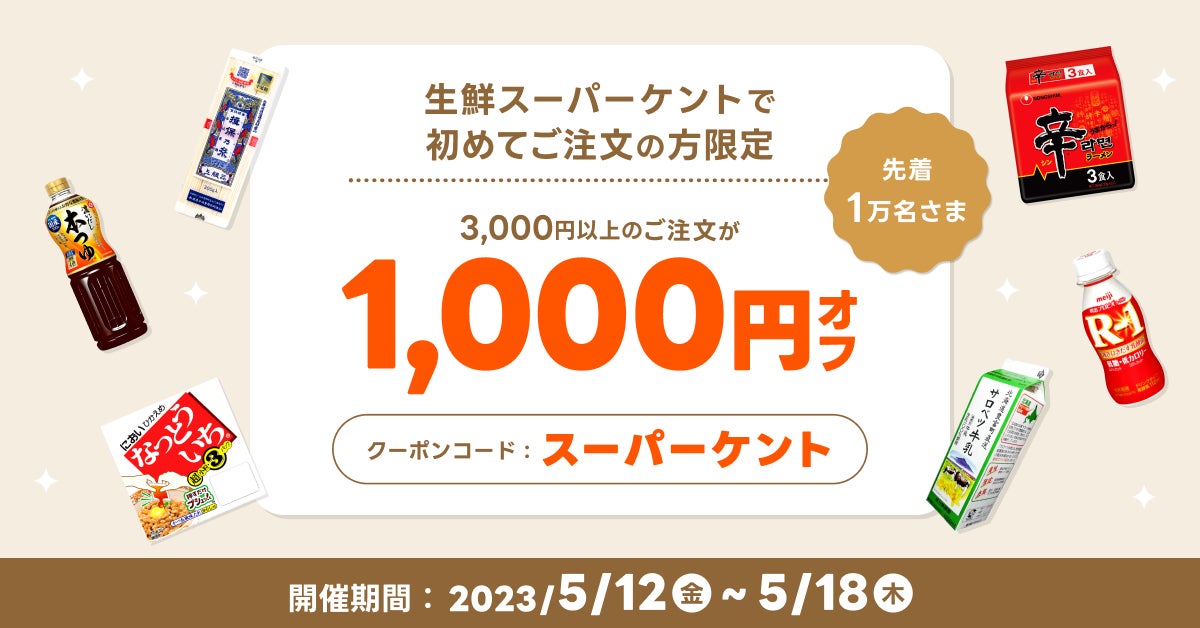 期間中、『出前館』から「生鮮スーパーケント」の商品を初めてご注文される先着1万名さま限定!クーポンコード入力で3,000円以上のご注文が1,000円オフとなります。