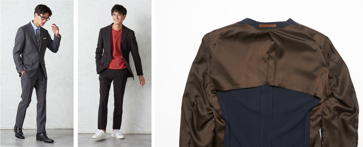 今回のオンラインショップ限定スーツは動きやすい仕様にこだわり、背中部分の裏地のゆとりを広げました。シルエットはそのままに背中裏地のキセを当社従来品のオンラインショップ限定スーツの2倍の3㎝にすることで背中周りが突っ張りにくく表地のストレッチ性を活かし、肩回りの動きをラクにしました。