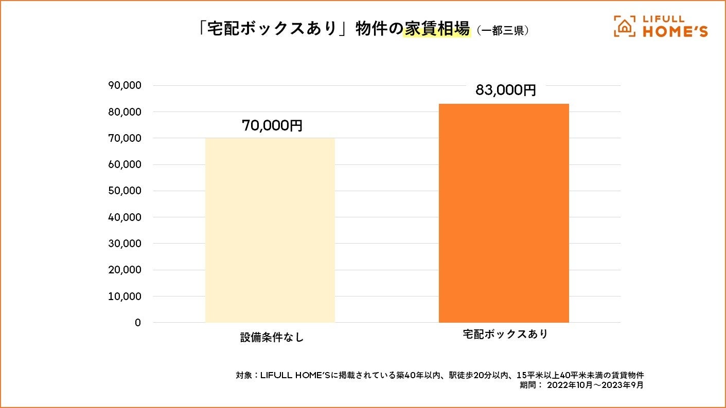 一都三県における「設備条件なし」と「宅配ボックスあり」の家賃相場(※1)を出したところ、「設備条件なし」は70,000円だったのに対し、「宅配ボックスあり」は83,000円となりました。月額で13,000円、年間では156,000円の差となり、けして誤差ではありません。一方で、今後実施される置き配のポイント還元や再配達を依頼する手間、配達時間に在宅していなければという心理的負荷を鑑みれば今後も「宅配ボックスあり」物件の人気は続くと思われます。