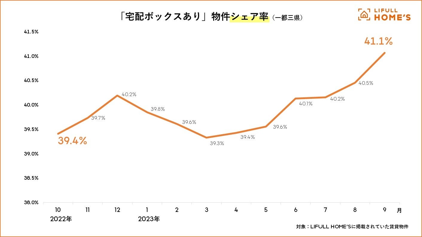 一都三県の賃貸マンション/アパートの中で「宅配ボックスあり」の物件割合を月毎に調べたところ、2023年3月以降緩やかに増加し、2023年9月には直近一年で最高となる41.1%となりました。コロナ禍におけるネット購入・非対面受け取りの需要増で爆発的に普及が進んだ宅配ボックスですが、企業の出社回帰も相まってか、今現在においても引き続き普及が進んでいるようです。