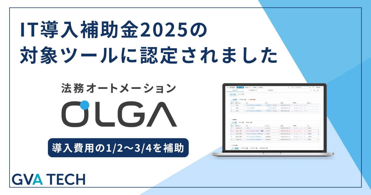 リーガルテックサービスを提供するGVA TECH株式会社(本社:東京都渋谷区、代表取締役:山本 俊、以下GVA TECH)が提供する法務オートメーション「OLGA」は、経済産業省が実施する「IT導入補助金2025」の対象ツールとして採択されたことをお知らせいたします。