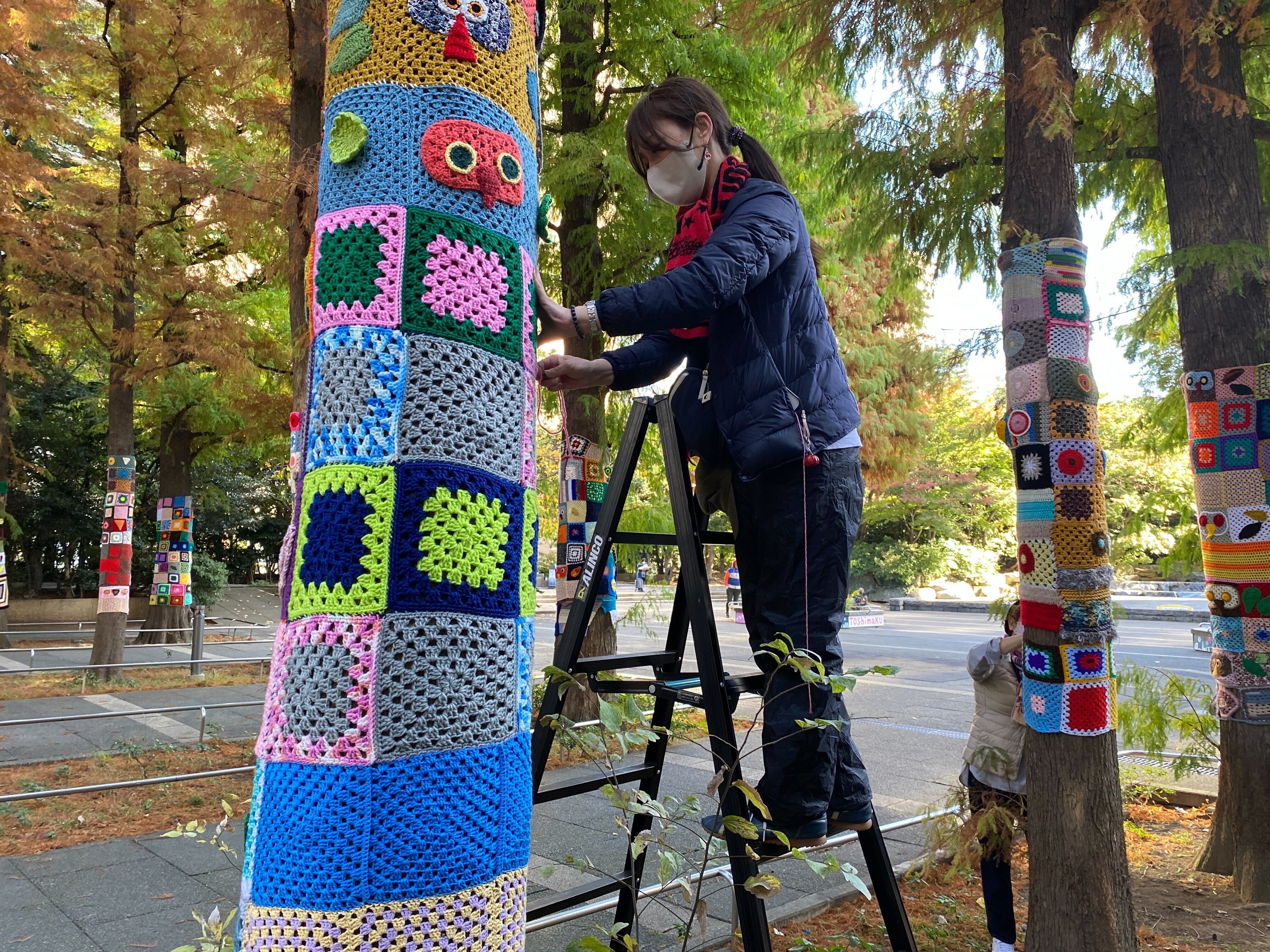 豊島区立南池袋公園の木々をニットアート「ヤーンボミング」で飾ります(2022年展示の様子)