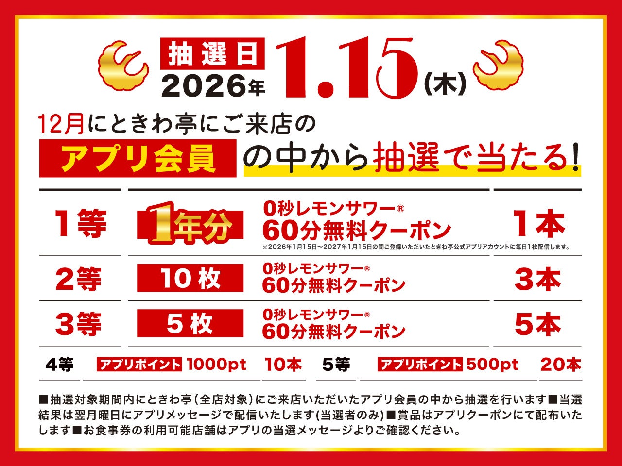 12月1日(月)~12月31日(水)の期間にときわ亭店舗を利用された全アプリ会員が対象で、2026年1月15日(木)に抽選を行います。1等は1年間分の「0秒レモンサワー®」60分無料クーポンをプレゼント。1年間、お好きなだけ「0秒レモンサワー®」がお得にお楽しみいただけます。その他、「0秒レモンサワー®」60分無料クーポンやアプリポイントをご用意します。
