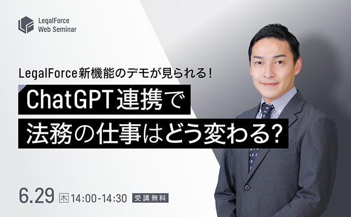 「ChatGPT」APIを活用した「条文修正アシスト」機能 提供開始記念セミナー 「デモが見られる!ChatGPT連携したLegalForceで、法務の仕事はどう変わる?」 6月29日(木)
