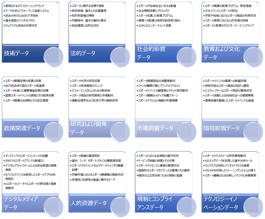 使用データ: 健康データ、スポーツ参加率、運動による健康改善効果の研究データ、トレーニング方法、選手のパフォーマンスデータ