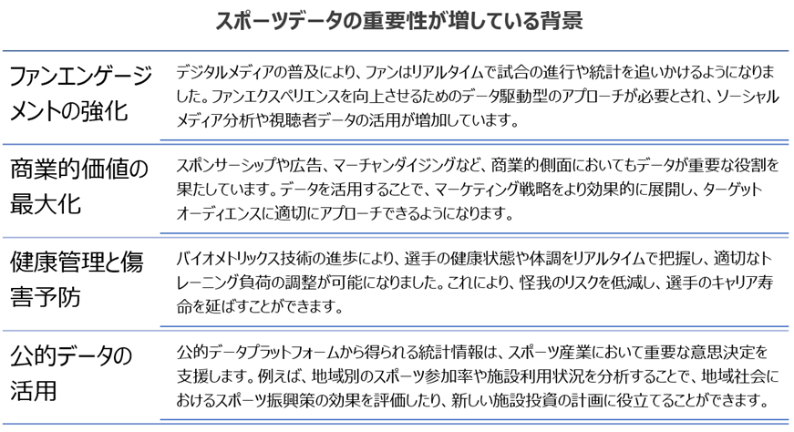 これらの要素が組み合わさることで、スポーツデータの重要性は今後も高まることが予想され、多様な利害関係者に対して価値を提供し続けるでしょう。