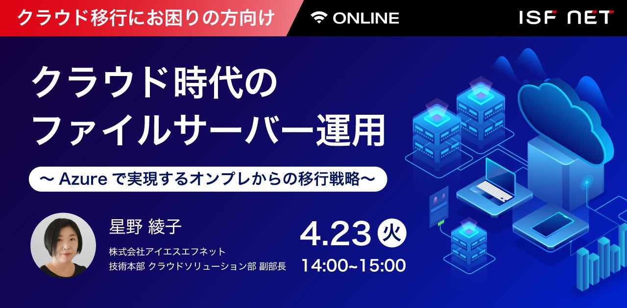 本セミナーでは、オンプレミスのファイルサーバーをクラウド(Azure)に移行する方法をご紹介します。サーバーレスで構成する方法やメリット、更にデータ移行やバックアップまで、ファイルサーバーをクラウドに移行するイメージをつかんでいただけます。