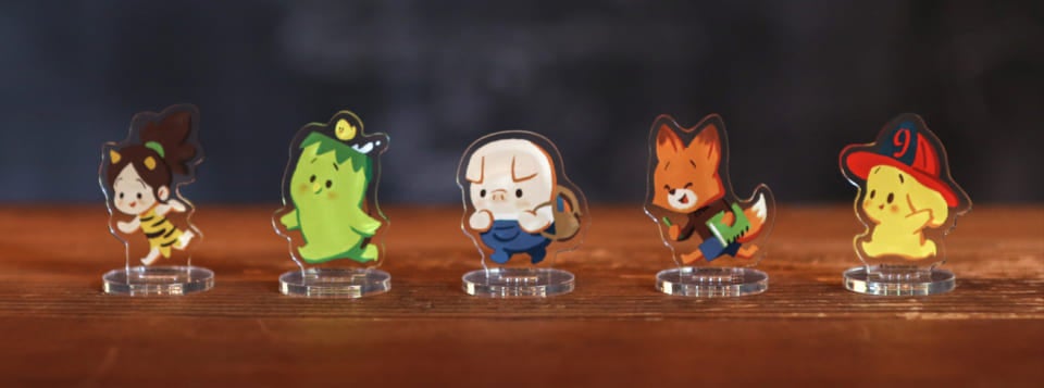 グッズショップには、かわいいキャラクターたちのぬいぐるみや、アクリルスタンドなどトンコハウスのオリジナルグッズがならびます。新商品として、本展の メインビジュアルがデザインされたステッカーも登場します。