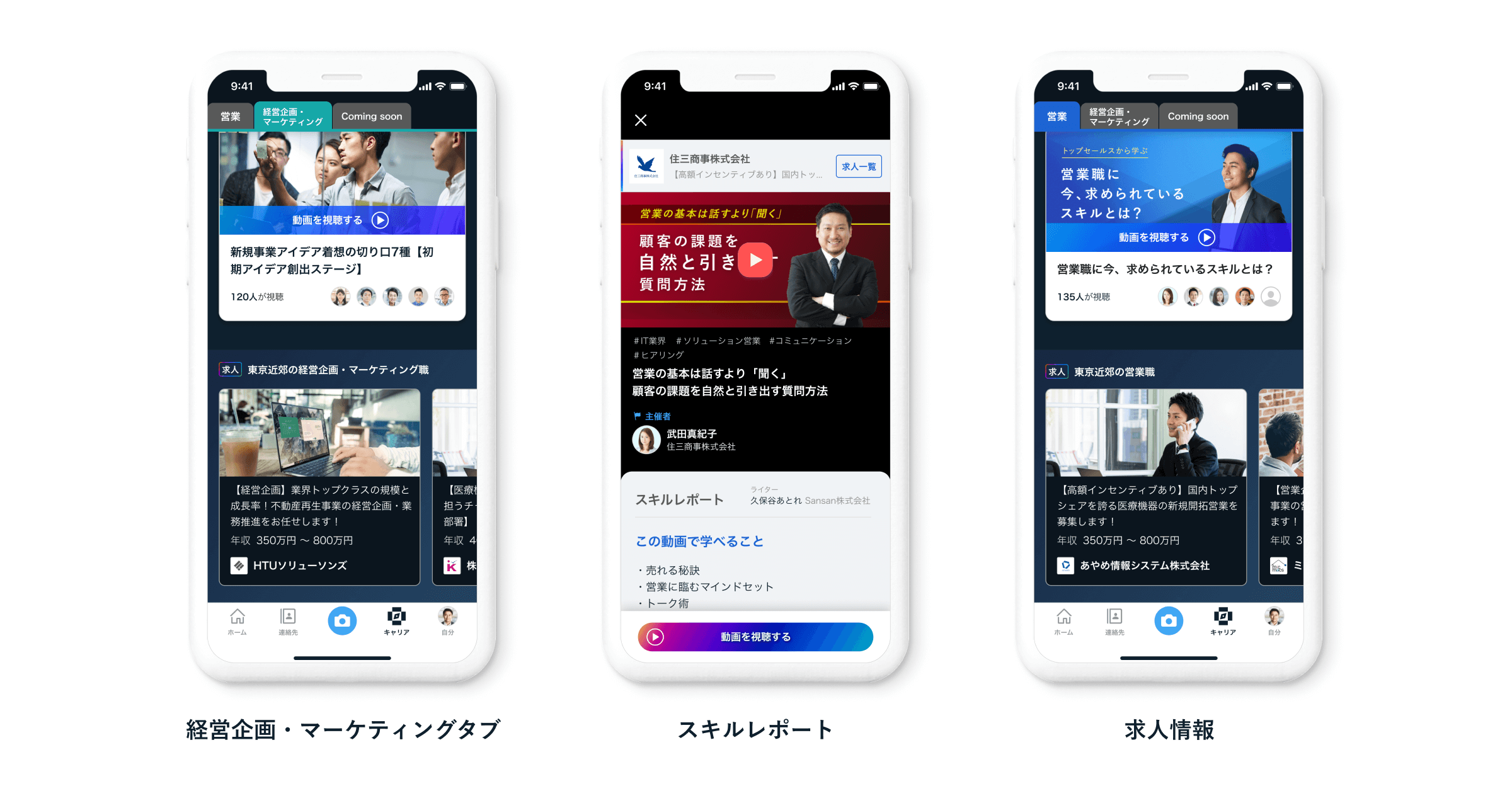オンライン学習サービス「Schoo」で提供している、録画授業などの学習動画を、キャリアタブで配信します。学習動画は、「ビジネス基礎力」や「デジタルリテラシー」など総合的な内容から、職種に特化した内容まで幅広いジャンルを取りそろえています。キャリアタブの「営業」に加え今回新たに追加する「経営企画・マーケティング」のカテゴリーにそれぞれマッチしたものを、スクーで選定し毎日1本ずつレポート記事と併せて公開していきます。ユーザーはどの動画も無料で視聴することができ、好きなときに、好きな場所で、好きな分だけスキルを学ぶことが可能です。