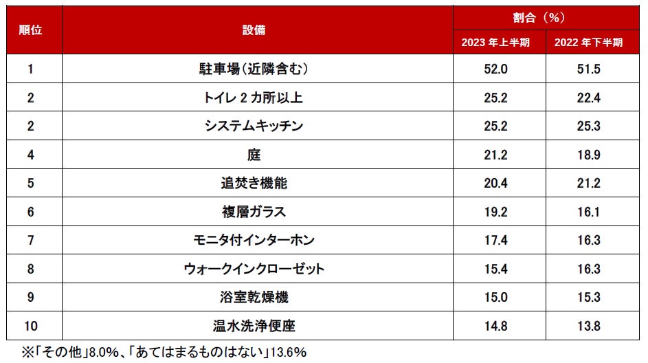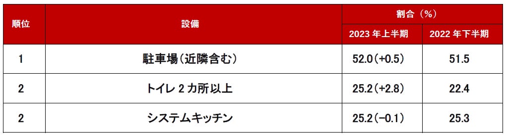 2位は同率で「トイレ2カ所以上」と「システムキッチン」でした。「システムキッチン」は、2022年上半期から継続してトップ3にランクインしており、一戸建て検討者が重視する設備のようです。