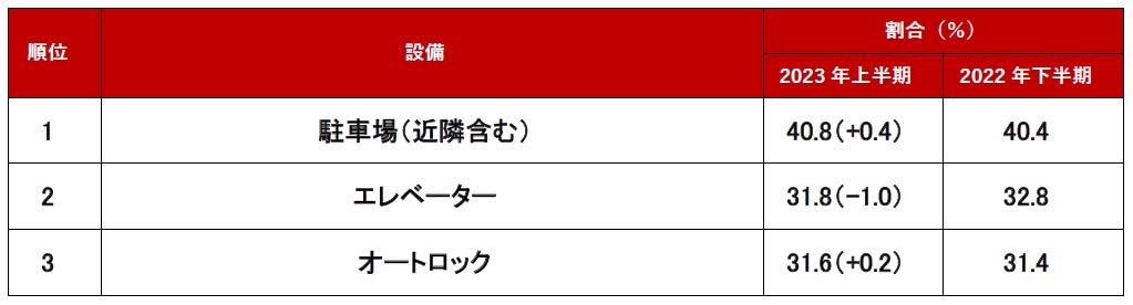 不動産のプロである不動産会社の方に、2023年上半期に問合せが多かったマンションの設備を聞いたところ、1 位は「駐車場(近隣含む)」、2位は「エレベーター」、3位は「オートロック」でした。2022年上半期以降、トップ3の変動はなく、マンション購入を検討する人にとって重要な設備であることが分かります。