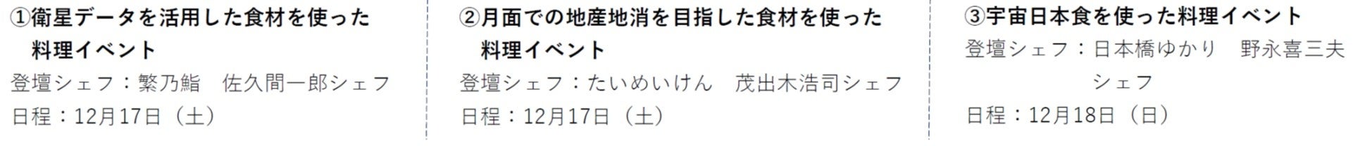 | ③宇宙日本食を使った料理イベント | 登壇シェフ:日本橋ゆかり 野永喜三夫シェフ 日程:12月18日(日) |