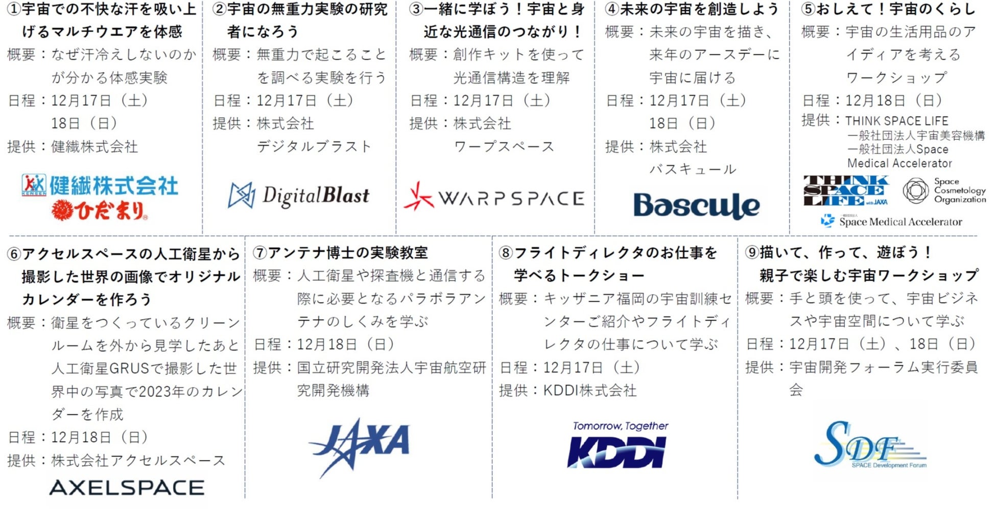 内容:宇宙ビジネス企業による宇宙ビジネスを学ぶトークショーや宇宙の仕事を体験できるワークショップを開催。初めて宇宙に触れるお子様もお楽しみいただけるイベントです。