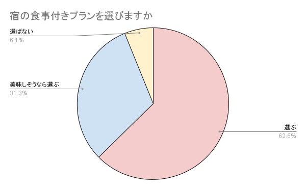 また、宿泊する宿では食事付きのプランを選択する方が62%、美味しそうなら食事付きプランにされるという方が31%という結果となりました。
