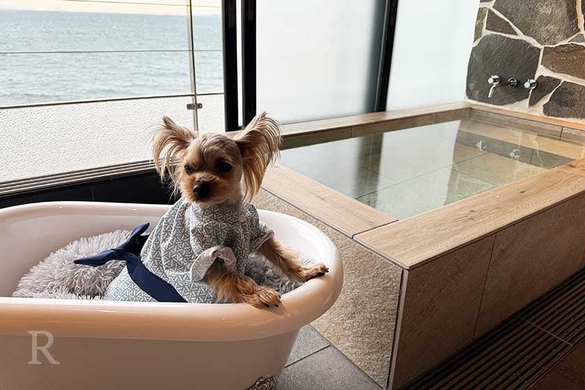 愛犬用の浴衣など貸衣装が無料でレンタルできたり、愛犬用バスタブまで用意されているので、温泉を入れてあげて一緒に絶景の客室露天風呂を楽しむことができます。